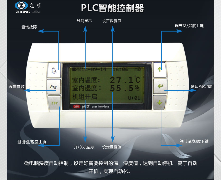 3、高性能電子電極加濕器:不滋生細菌,對室內空氣無污染;對水質無特殊要求,無需水處理;獨立加濕器控制板,自動定時換水清洗,延長使用壽命,能自動根據加濕要求控制水位及加濕電極電流,實現高精度控制,真正滿足高精度要求;